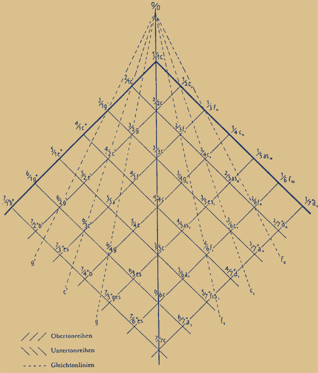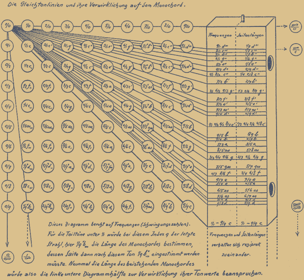 Das Bild rechts zeigt eine Zeichnung vom Musiktheoretiker Hans Kayser, welches die Beziehung zwischen dem Lambdoma und dem Monochord darstellt.