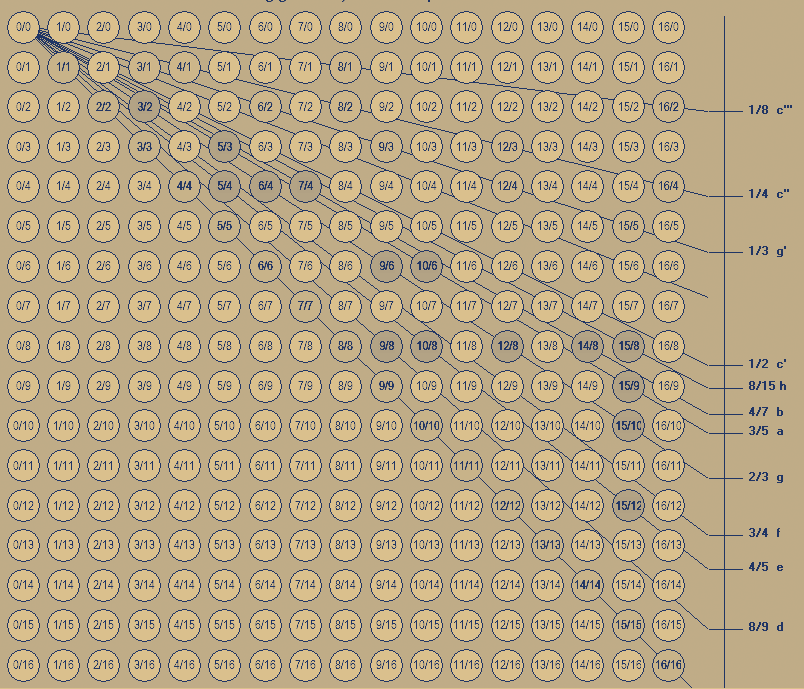 Die im Lambdoma eingezeichneten Gleichtonlinien stimmen mit den Saitenabschnitten des Monochords überein.