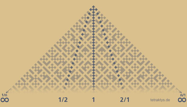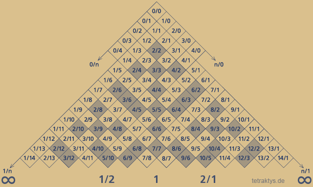 Bei den Achsen 1/2 und 2/1 ist es nur noch jeder zweite aufeinander folgende Bruch, der jeweils den gleichen Wert hat, usw...