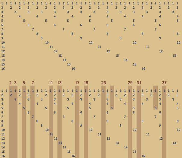 Direkt darunter sehen Sie die selbe Tabelle mit den hervorgehobenen Primzahlen. Das Verständnis dieser Abbildung int ungemein hilfreich für die folgenden Betrachtungen.