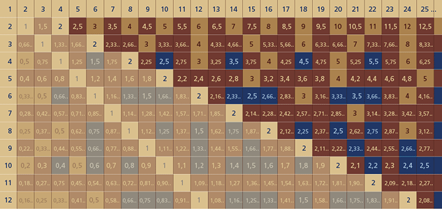 Da ist die Zahlentabelle vereinfacht so dargestellt wie hier rechts abgebildet. Statt der Quotienten mit den entsprechenden Zahlenbrüchen werden lediglich die Teiler zeilenweise dupliziert angezeigt.